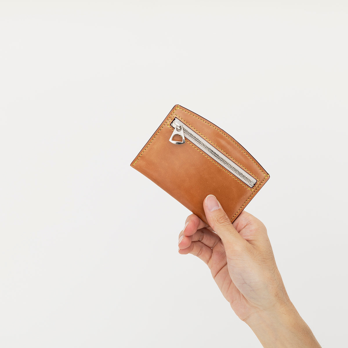 A wallet for minimalists who want to carry as little as possible. It is a compact and lightweight item that can also be used as a business card holder. The outer zipper pocket is card-sized and can be used as a coin pocket as well as an IC card pocket. It can hold up to eight cards inside, and if you store bills folded in half in the main pocket, it becomes the smallest and thinnest mini wallet. It is recommended for those who want to carry only the amount of money, cards, and coins they need.