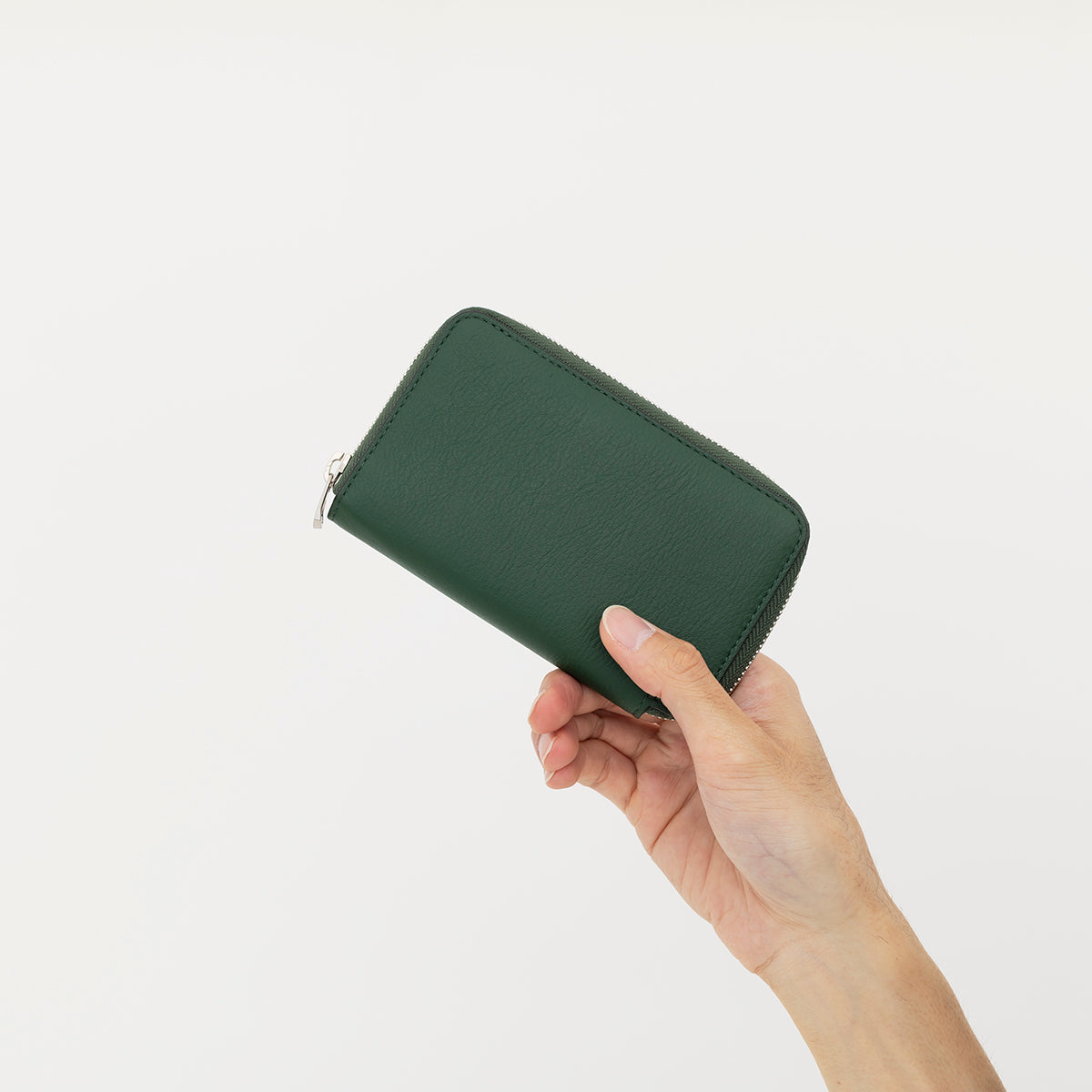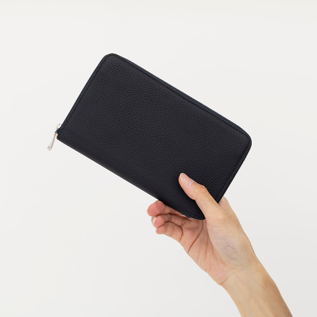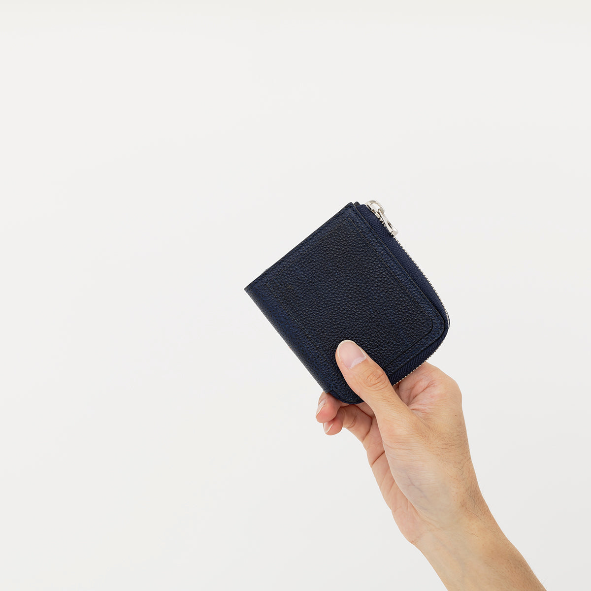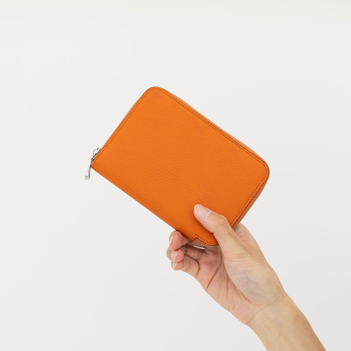 A compact wallet with a round zipper that prioritizes thinness. The exterior is accented with a gusseted zipper pocket. The right side of the interior has two card slots and a flap with a pocket that can hold several looped cards. Bills can be stored without folding, and there are slits on both sides that can hold two cards. Despite its sleek body, it can hold about 10 cards. It is a convenient size to carry around, not too big or too small, and fits comfortably in one hand.